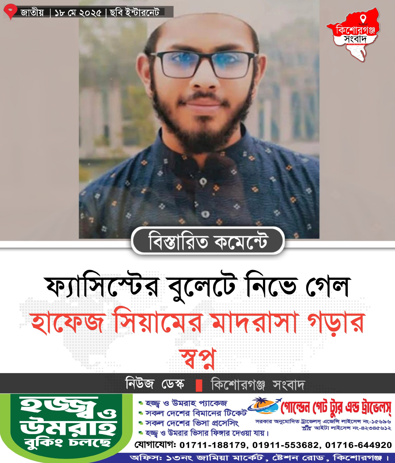 সিরাজগঞ্জ জেলার এনায়েতপুর থানার গোপরেখি দক্ষিণ গ্রামে জন্ম নেওয়া হাফেজ সিয়াম ছিলেন এনায়েতপুর ইসলামিয়া ফাজিল মাদরাসার নবম শ্রেণির ছাত্র এবং পবিত্র কোরআনের হাফেজ। তার জীবনের প্রতিটি শ্বাস-প্রশ্বাস জুড়েই ছিল ইসলাম, শিক্ষা এবং দেশপ্রেমের দৃপ্ত ছাপ। গ্রামে মাদরাসা না থাকায় একসময় তার মধ্যে তৈরি হয় এক অভাববোধ, যা থেকেই জন্ম নেয় নিজের হাতে একটি মাদরাসা গড়ার দৃঢ় সংকল্প।